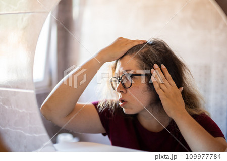 Gray haired surprised caucasian middle aged woman looking at grey hair head in mirror reflection. Early gray hair concept
