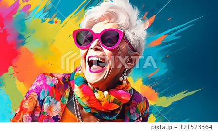 Cheerful glamorous old woman with gray hair. Concept of fun old age or eternal youth