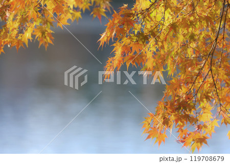 岩手県盛岡市高松池の水面の秋の黄葉紅葉