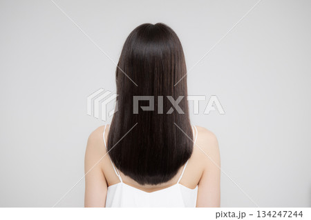 美容ポートレート、ストレートのロングヘアの髪の毛の天使の輪が綺麗なヘアケアイメージ 美しい髪と後ろ姿
