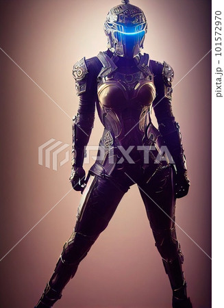 Portrait of a sci-fi cyberpunk warrior. High-tech futuristic woman from the future. The concept of virtual reality and cyberpunk. Generative AI Art.