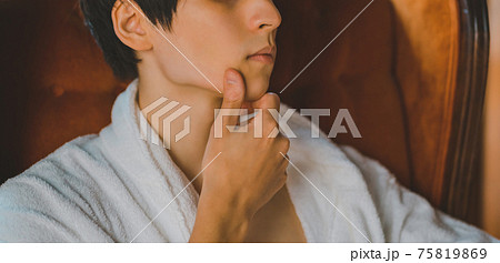 頬を触る若い男性 美容男子