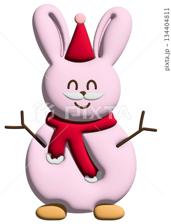 Cute inflated 3D illustration of pink bunny as snowman for Christmas model, festive winter season, sticker, animal, zoo, souvenir shop, cartoon character, standee, patch, card, brooch, mascot, pin