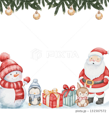 Cute watercolor Christmas illustration featuring Santa Claus, snowman, penguin, rabbit, gift boxes, fir branches, and decorations. Festive template with space for text on white background