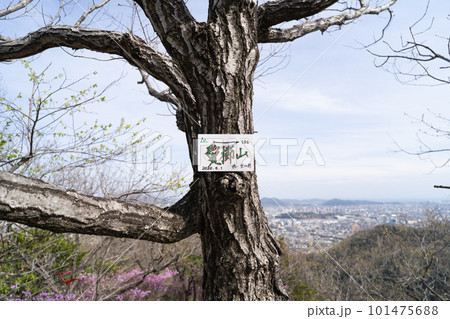 春の群馬県榛名山(相馬山)の麓から榛名富士と鬢櫛山、烏帽子ヶ岳を見る