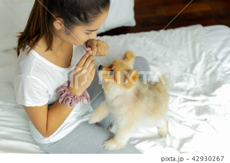 Mixed Race teenage girl teaching pomeranian dog to do a trick on the bed.