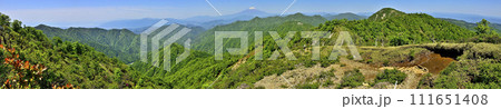 丹沢山地の棚沢ノ頭山頂からのパノラマ 初夏の富士山と緑の山地