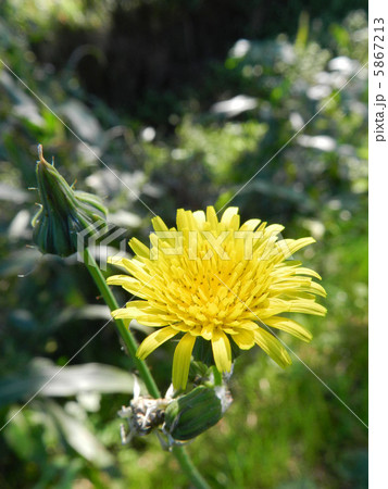 日本の冬の野原に咲く黄色いオニノゲシの花
