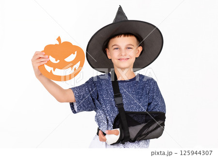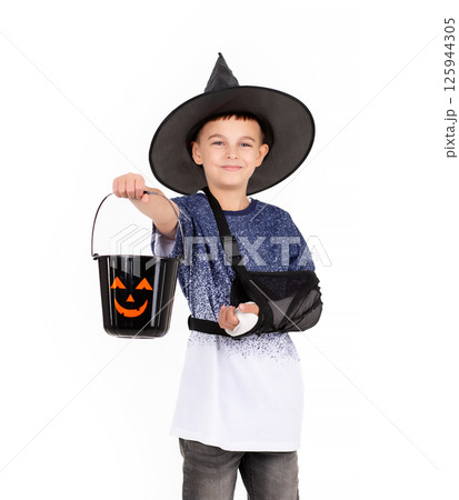 Halloween celebration concept. Portrait emotional cheerful boy in black witch hat with an injured hand, with bucket pumpkin Jack for sweet candies. Isolated white background