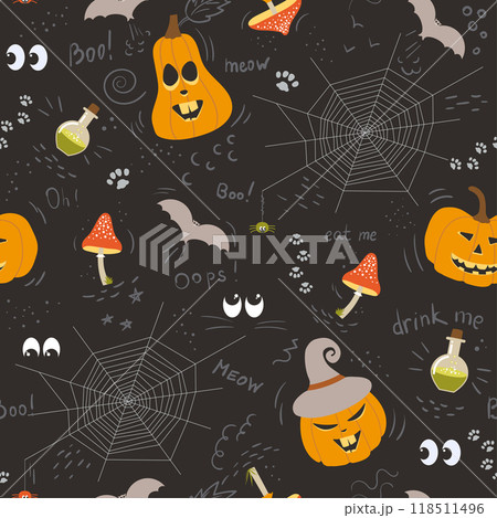 Cartoon Halloween seamless background. Bat and pumpkins, mushrooms, spider web, paw cat. Vector