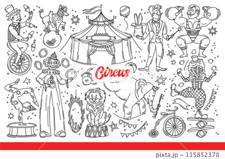 Circus performers and animals entertain spectators during performances in tent. Hand drawn doodle