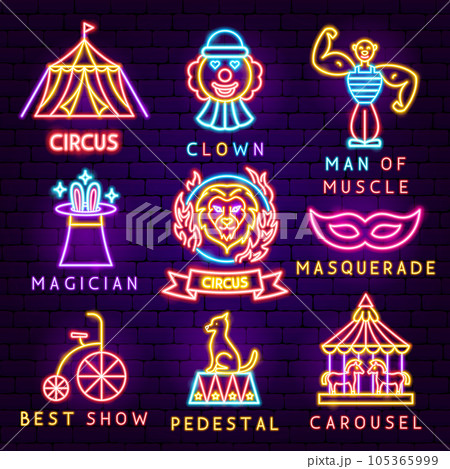 Cartoon circus elements with clown, magician man and animals