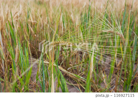 Green corn sprouts, a field with a future corn harvest in sunny weather. Selective focus.