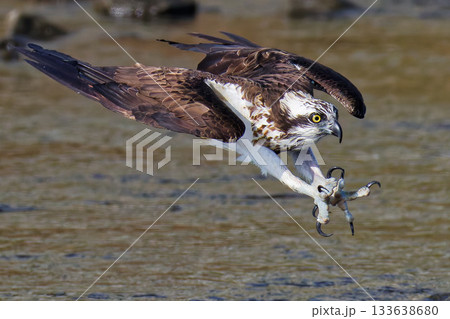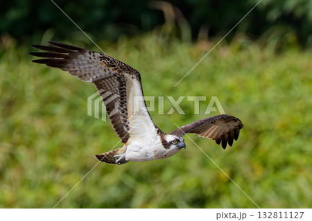 魚を掴んで羽ばたきながら飛行するミサゴ