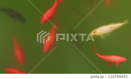 Surface Ripples While Carp Fish Swim In Pond. Group Of Goldfish Swimming Together In A Pond.