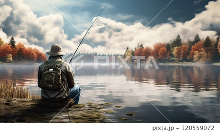 Vintage man fishing at lakeside in early morning. Retro outdoor scene with calm water and countryside. Design for greeting card, poster, banner, postcard