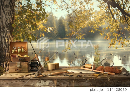 Fishing Day Celebration with Gear and Freshly Caught Fish on a Rustic Wooden Surface
