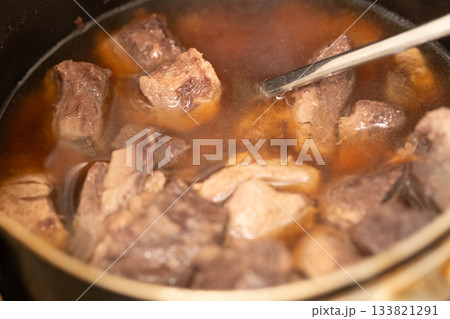 鰹節入りのスープ鍋とザルに盛られた鰹節