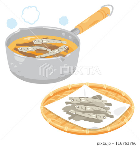 煮干し入りのスープ鍋とザルに盛られた煮干し