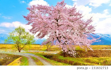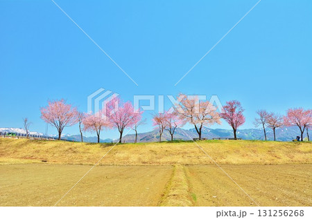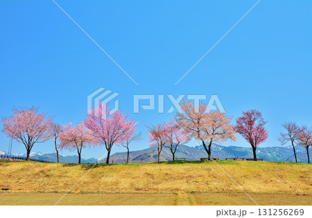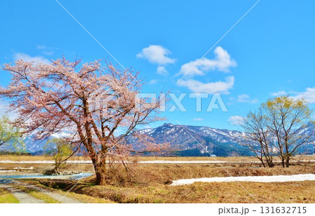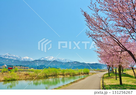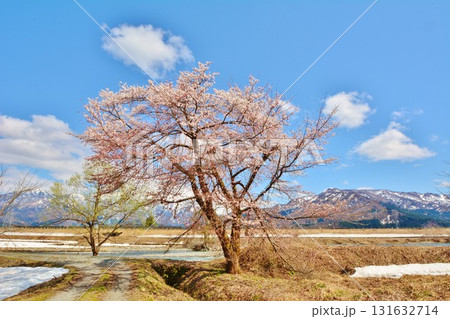 早春残雪の新潟県南魚沼市塩沢石打・魚野川に咲く桜風景