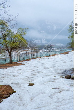 雪どけの魚野川河川敷 神弁橋からの眺め 関越自動車道湯沢IC付近 残雪 早春の風景