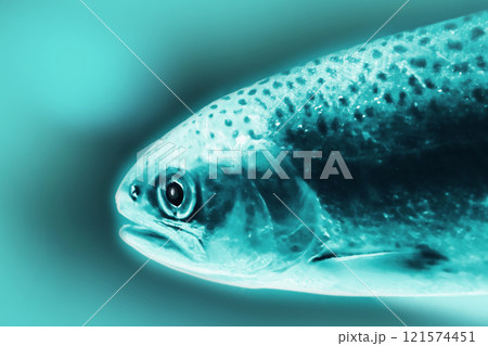 青く冷たい水中を鱒が泳ぐ(頭部半身・アートイラスト調レタッチ&色彩加工イメージ)