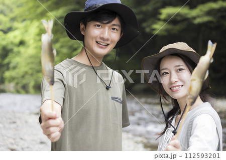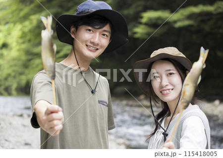 キャンプ場で鮎の塩焼きを食べるカップル