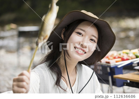 キャンプ場で鮎の塩焼きを食べる若い女性 バーベキューイメージ
