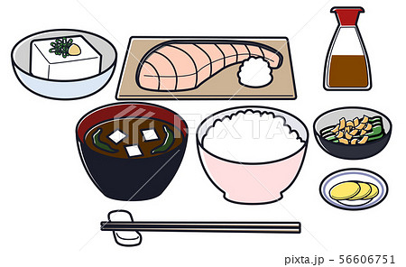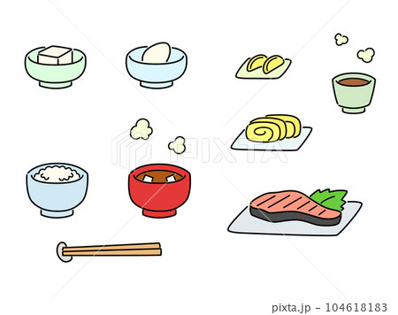 筆タッチの味噌汁と沢庵の焼き鮭の和食イラストセット