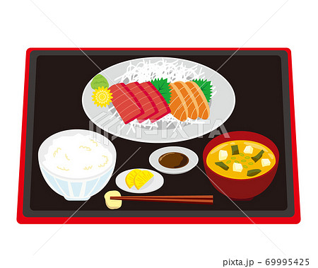 鮪とサーモンの刺身定食のベクターイラスト 味噌汁 ごはん
