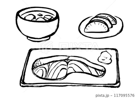 筆タッチの味噌汁と沢庵の焼き鮭のモノクロ線画イラストセット