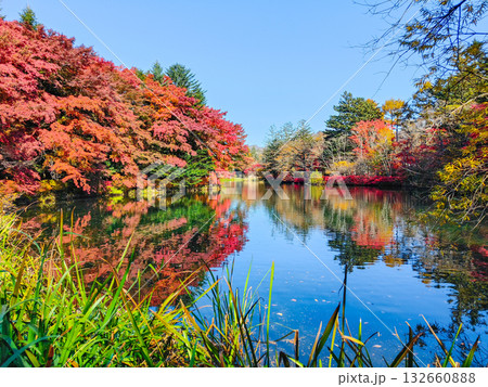 【紅葉素材】曇りの日の柔らかな光の下の雲場池の紅葉【長野県】