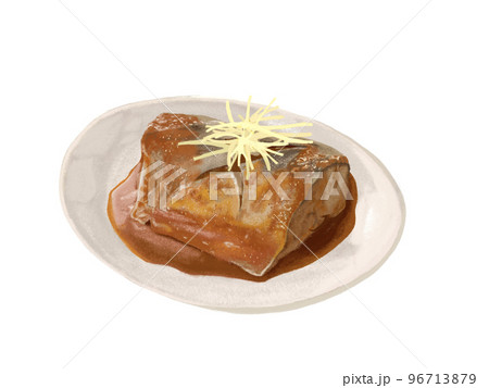 単体の皿に盛ったサバの味噌煮(手描き、リアル、写実)