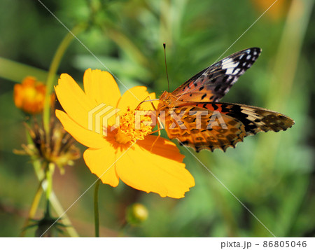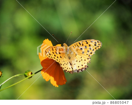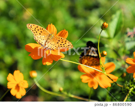 キバナコスモスの蜜を吸うヒョウモンチョウ 鯛生家族旅行村 大分県日田市中津江村合瀬