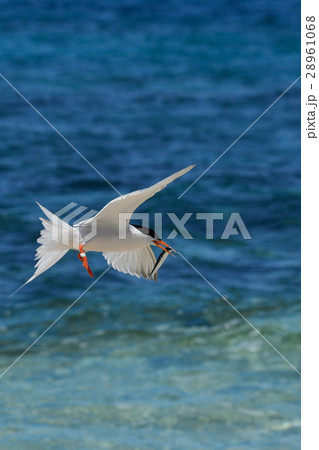 小魚をくわえたベニアジサシの飛翔