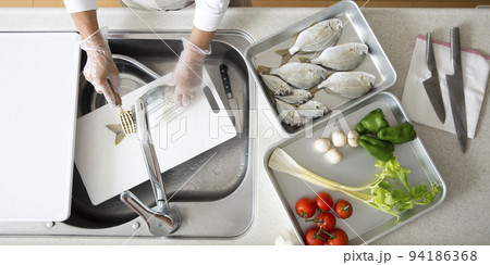 キッチンで魚を料理する日本人の主婦の手元、釣魚のヘダイを料理する