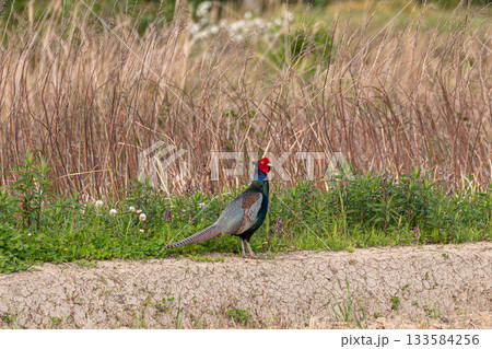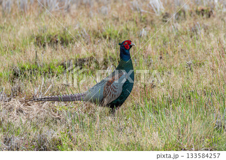草原を歩くオスのキジ
