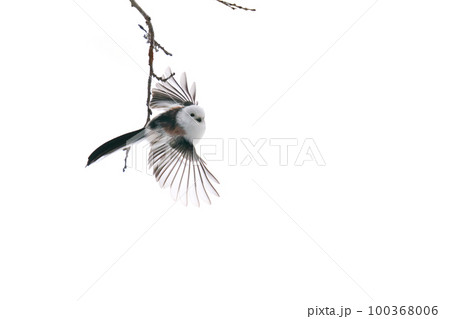 翼を広げて木の枝から飛び出したシマエナガ
