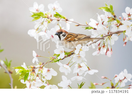 美しいソメイヨシノ(桜)の間を飛び回り盗蜜する可愛いスズメ(スズメ科) 横浜市鶴見区、矢向一丁目公園