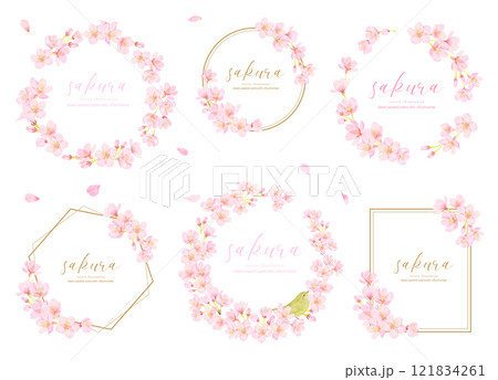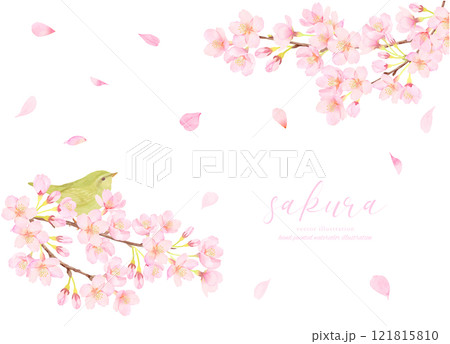 桜のフレームイラストセット。さくらの花びら。春の鳥、メジロ。かわいい春素材、あしらい。
