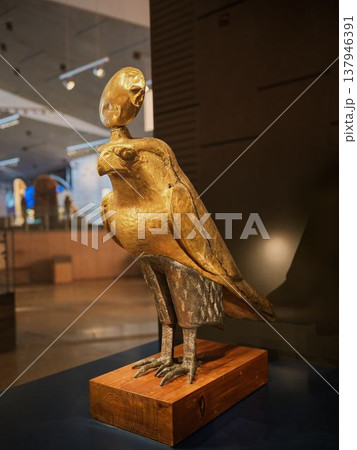 太陽円盤を戴くハヤブサ像、古代エジプトのホルス神表現