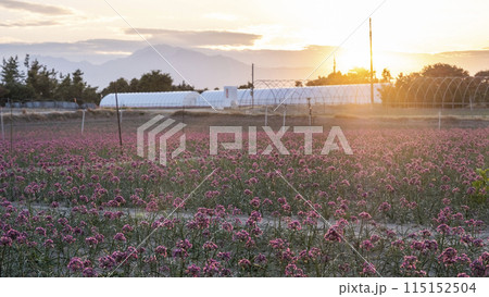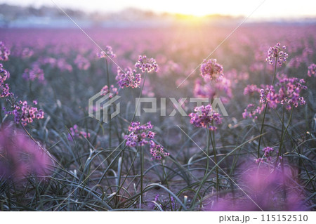 夕日で輝くラッキョウの花 鳥取県北栄町