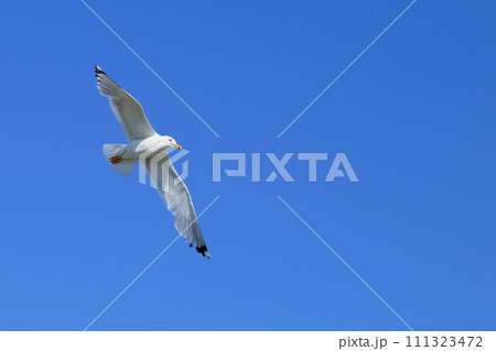 Flying seagull. Seagull on the background of a clear blue sky with a wingspan to their full length.