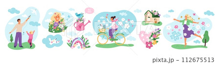 Happy spring people. Guys and girls enjoy warm weather and awakening nature. Seasons change. Summer birds and flowers. Sky rainbows. Woman on bicycle. Family fly kite. Garish vector set