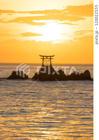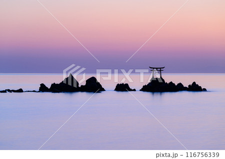 夕暮れ時の美しい二見ヶ浦の白い鳥居と夫婦岩(福岡県糸島市)