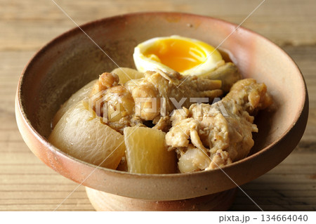 手羽元と大根と卵の甘辛煮を黒背景で撮影