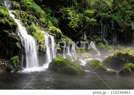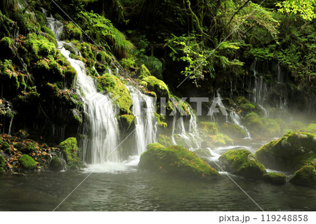 秋田県/ 朝霧を纏い幻想的な夏の「元滝伏流水」