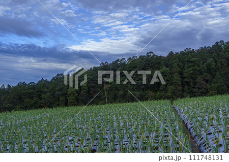 A lush green covered in Mount Sumbing slope of vegetables, taken from an aerial view.