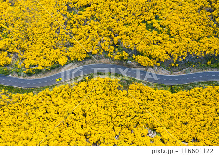 Car on Road on Yellow Blooming Hill Slope. Aerial Drone Shot. Madeira, Portugal