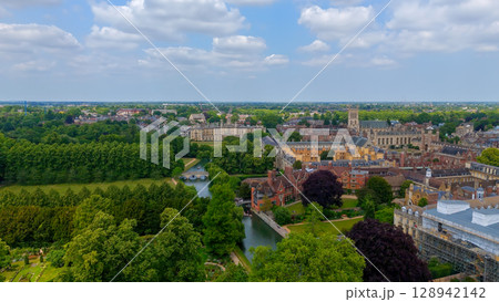 Cambridge University buildings and River Cam flowing through green park in a sunny summer day